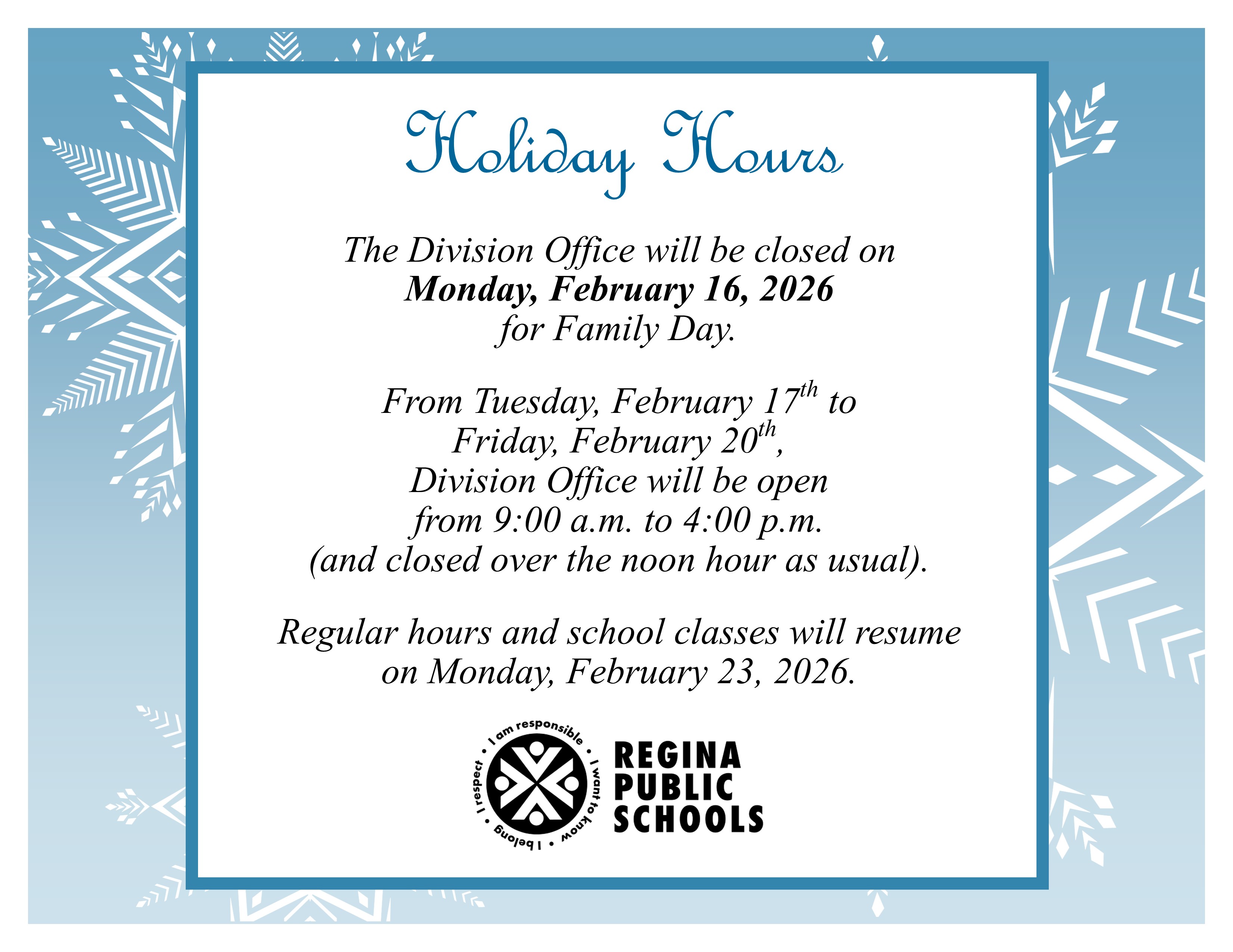 From Tuesday, February 17th to Friday, February 20th, Division Office will be open from 9:00 a.m. to 4:00 p.m. (and closed over the noon hour as usual). Regular hours and school classes will resume on Monday, February 23, 2026.