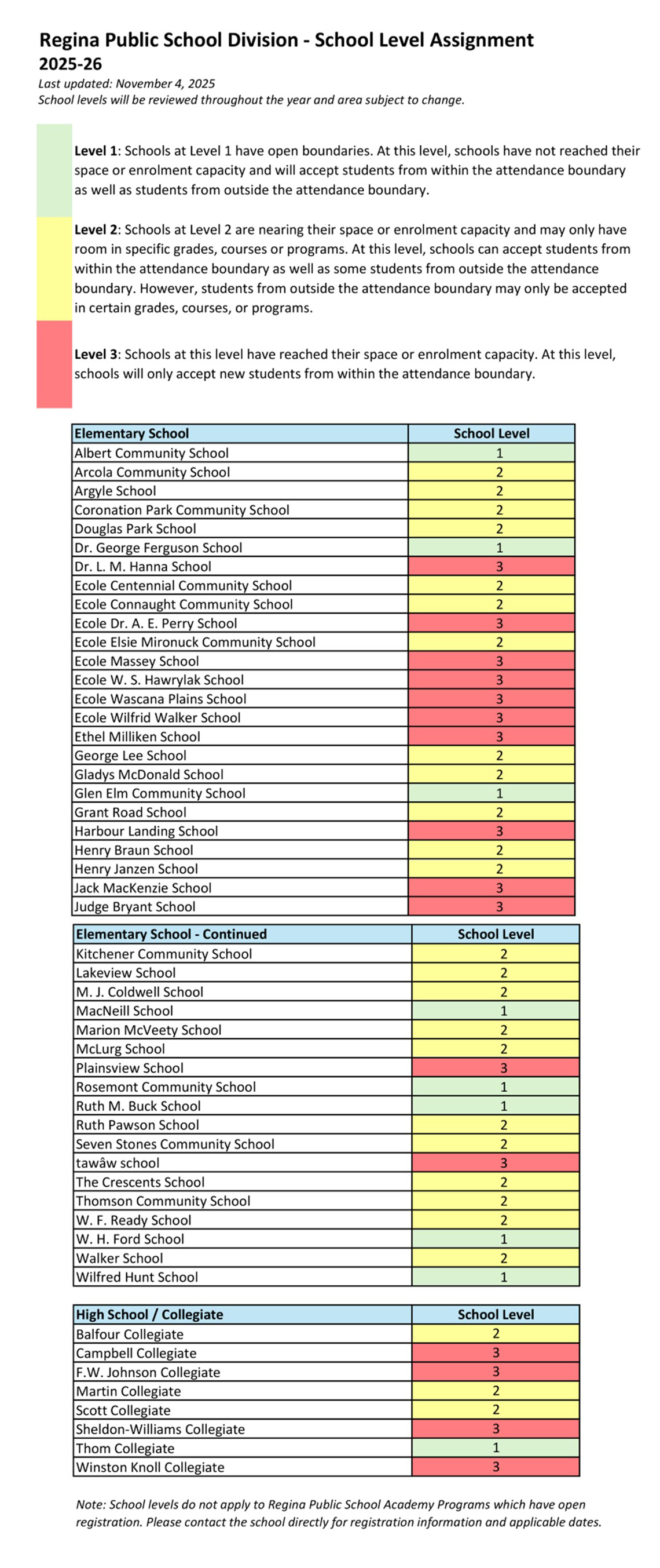 For information on school capacity levels and the assigned level for each Regina Public school, please refer to the chart below and the following linked file: