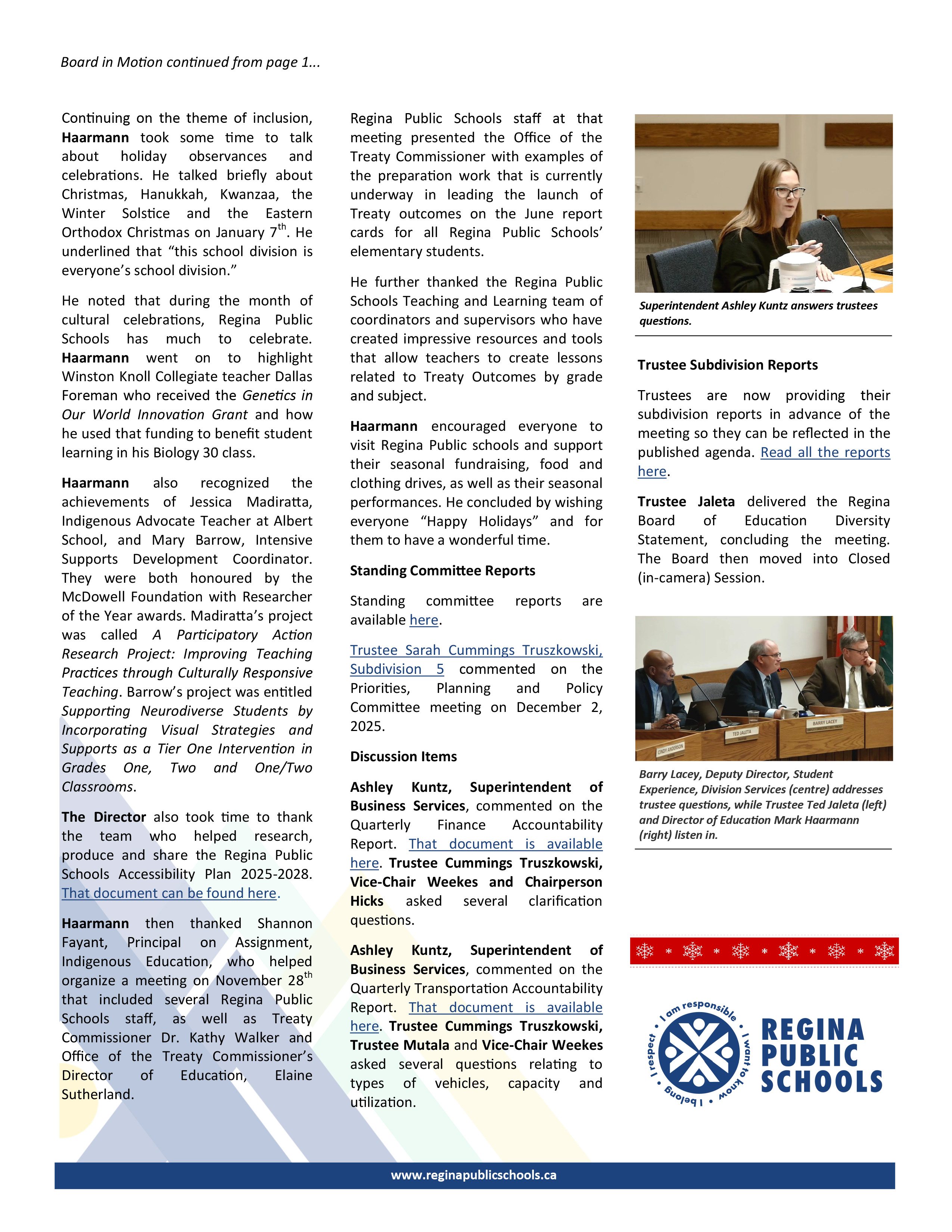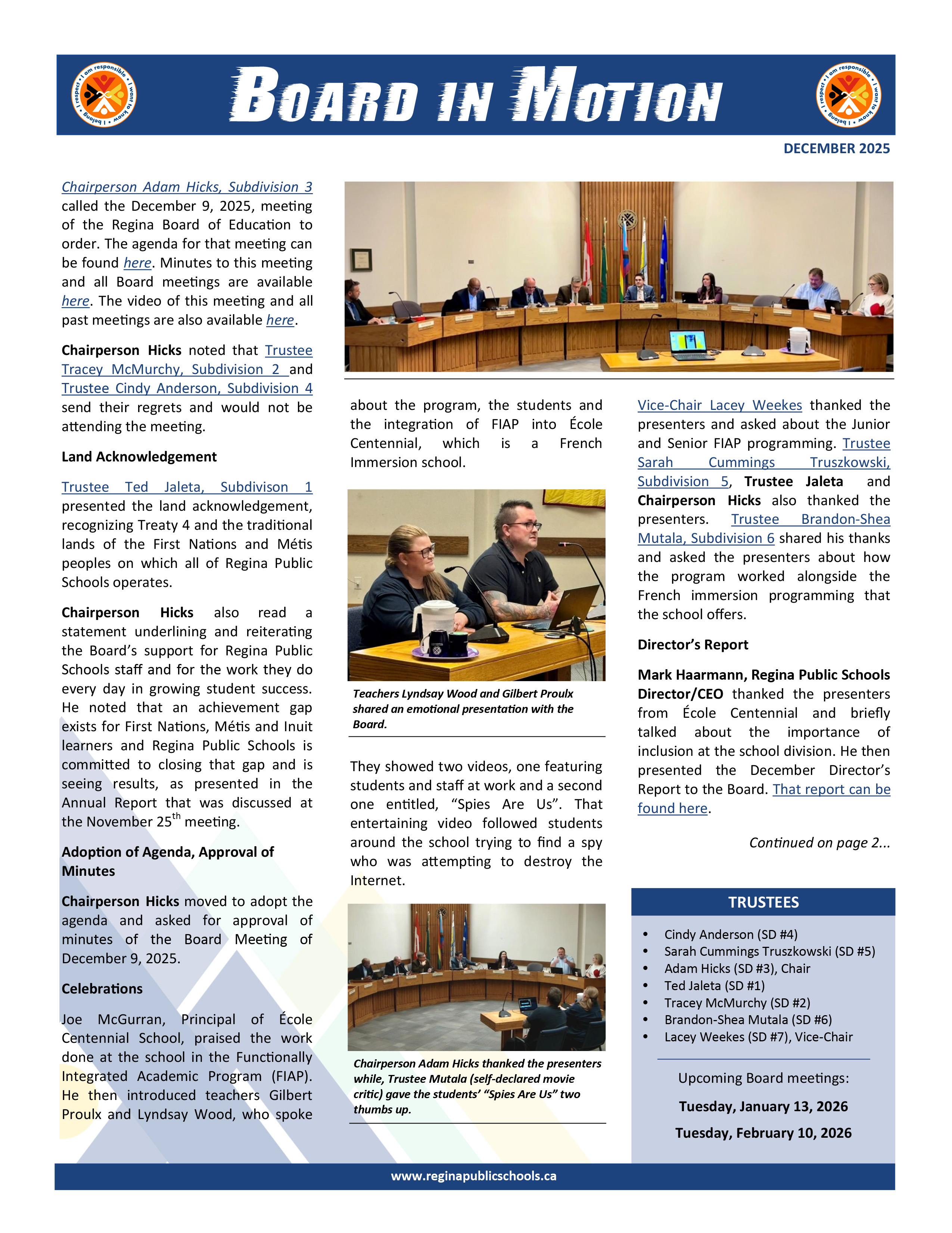 DECEMBER 15, 2025—The December issue of the Regina Board of Education's "Board in Motion" newsletter can be found here. This issue includes details of the Board meeting, which was held on Tuesday, December 9th.