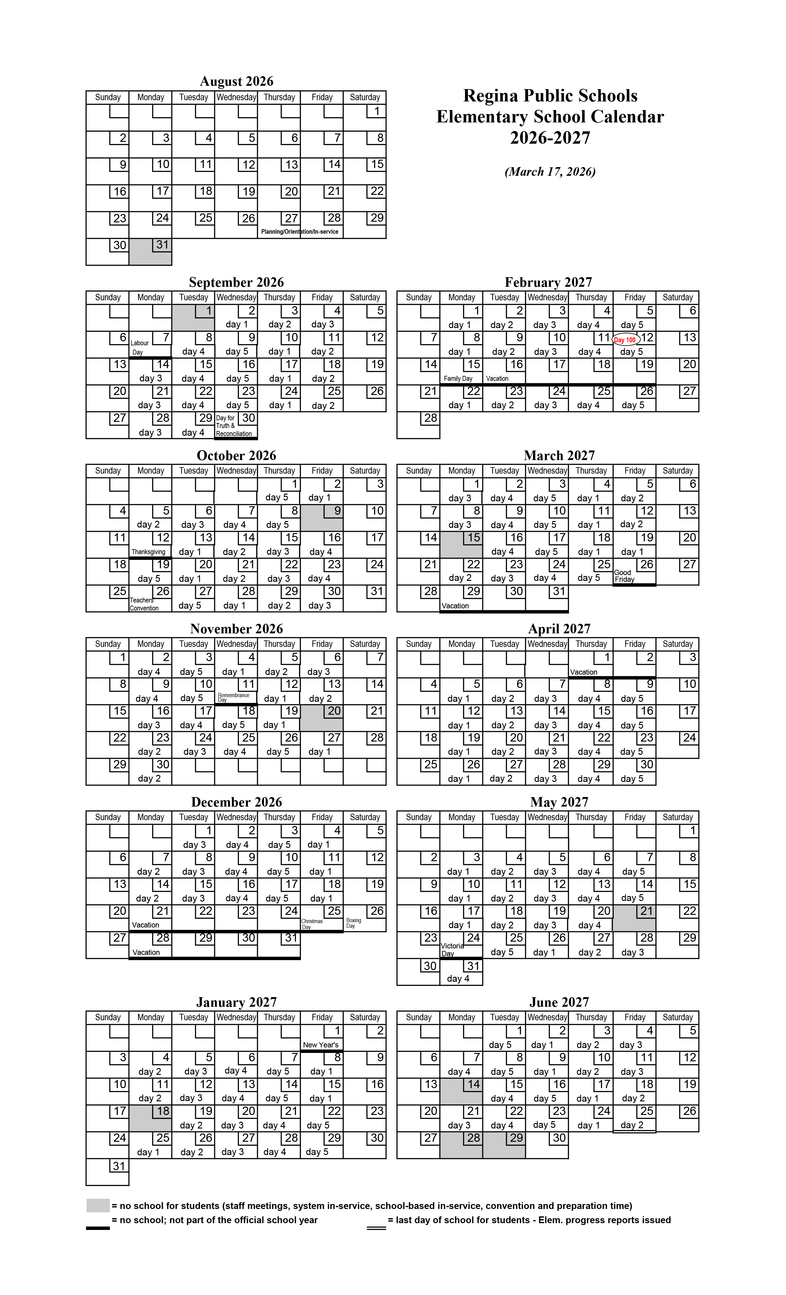 Elementary Day 1-5 Calendar 2026-27