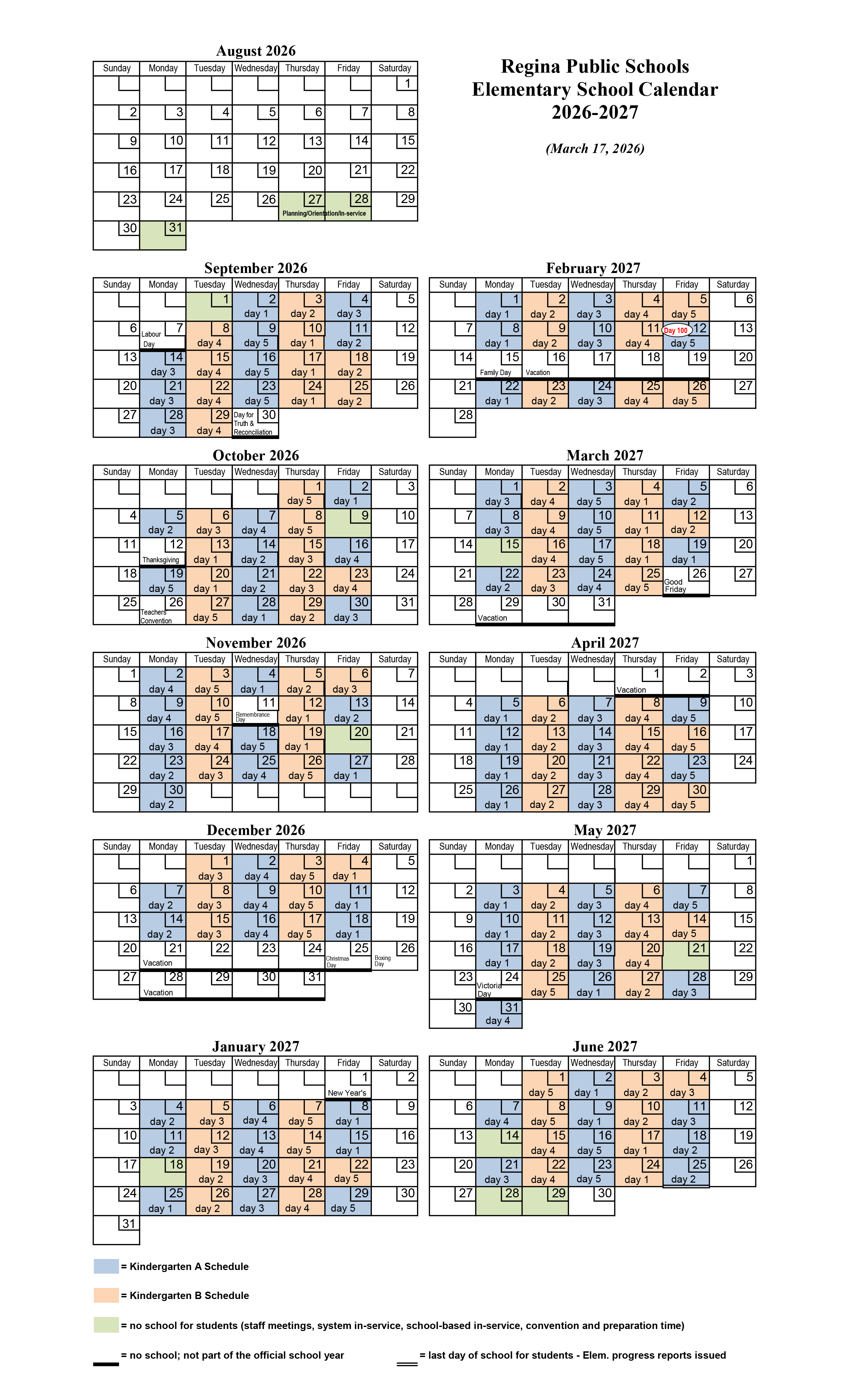 Kindergarten Calendar (A/B) 2026-27