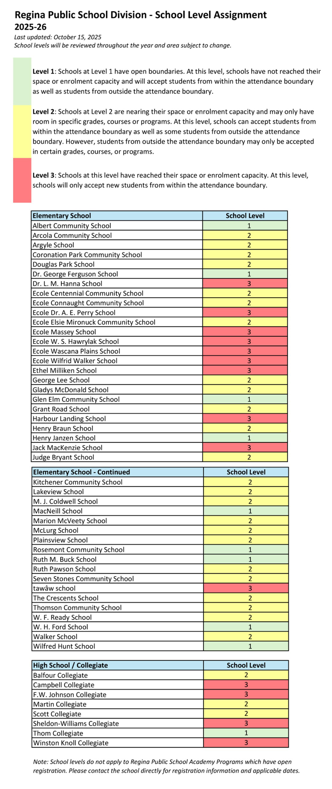 For information on school capacity levels and the assigned level for each Regina Public school, please refer to the chart below and the following linked file: